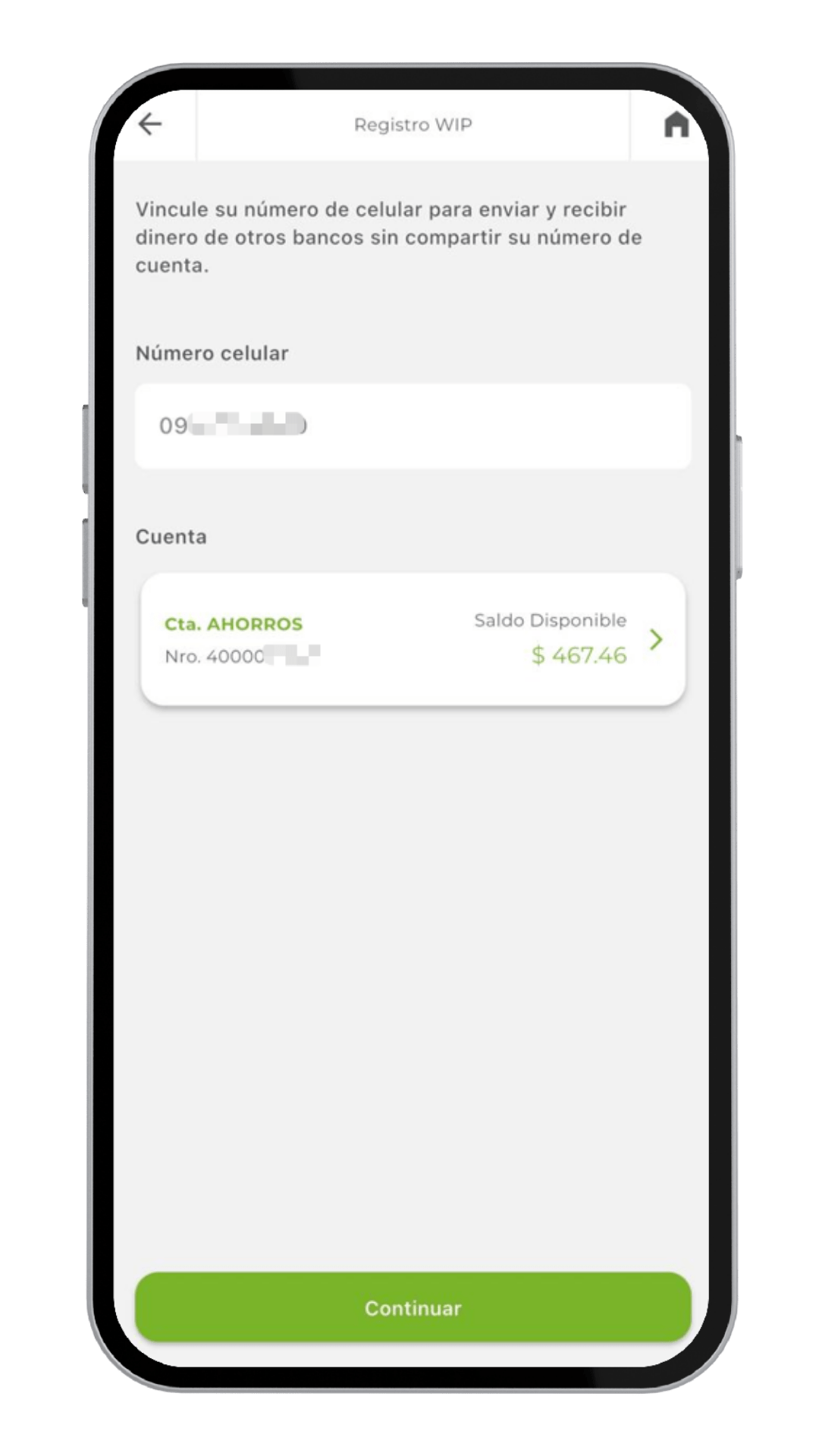 - En la Opción Wip, vincula tu cuenta con tu número celular, recuerda que el número celular es el que tienes registrado en tu entidad financiera.